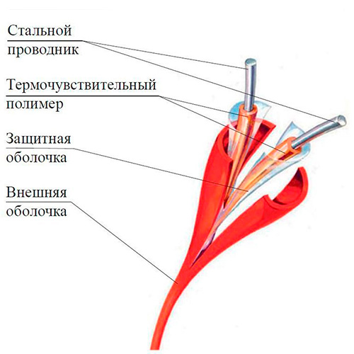 Извещатель тепловой линейный (термокабель) в химически-устойчивой фторполимерной оболочке, t-сраб.88°C (С), t-раб.-55...+60°C. Цвет красный. 1 метр.